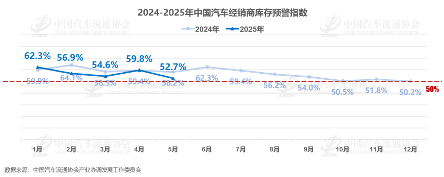 2025年5月中国汽车经销商库存预警指数为52.7%